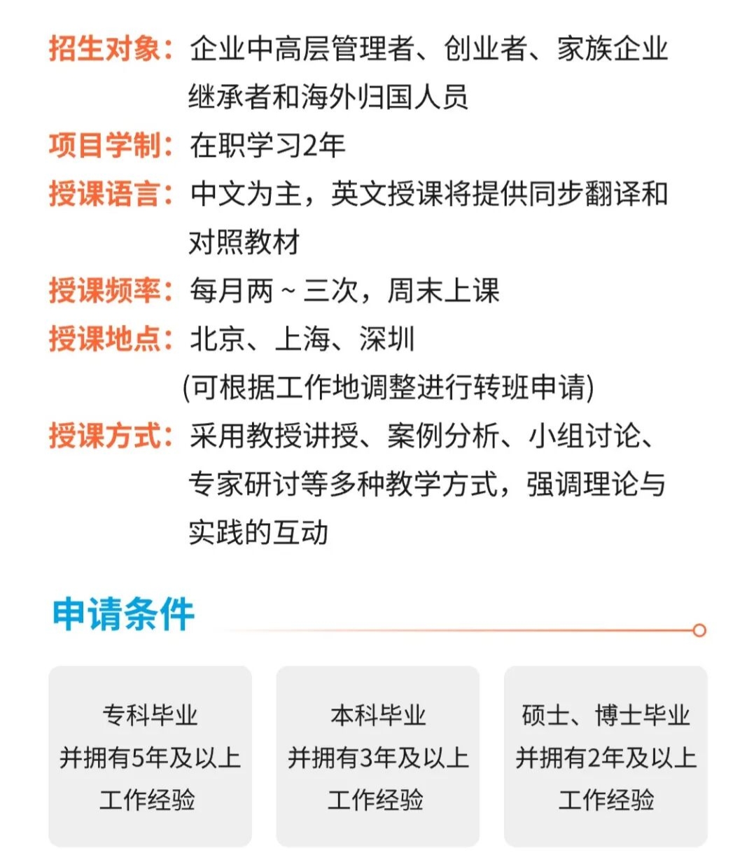 2、三大在职方向:MBA项目下设综合管理MBA、金融MBA、新商业科技MBA三个专业方向,满足不同领域的职业发展需求 。